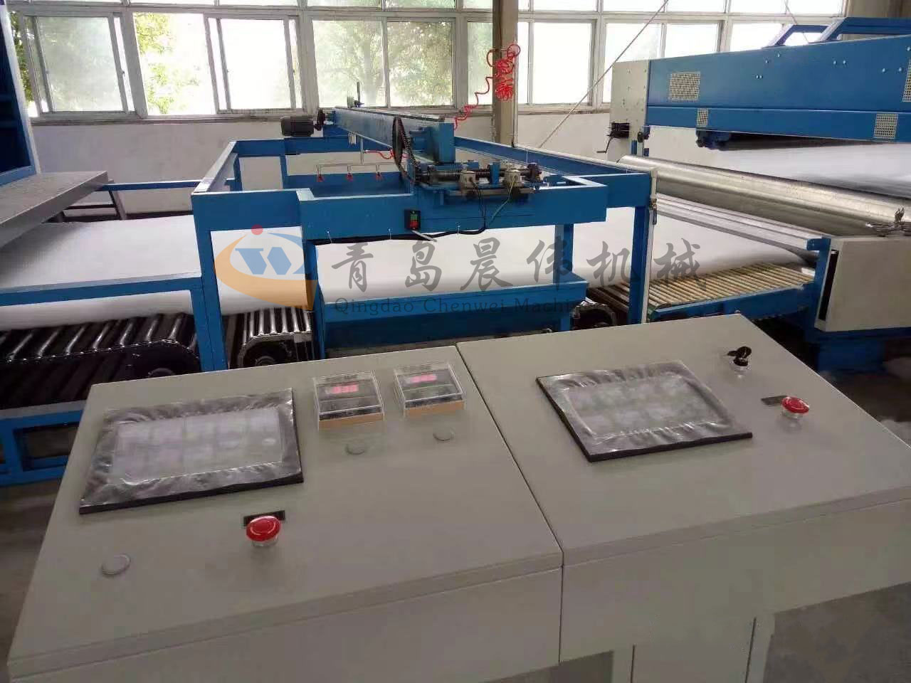 5. CWPW-鋪網(wǎng)機:用于將梳理纖網(wǎng)通過移動小車交叉折疊為所需幅寬和定量的多層纖網(wǎng),以供后道工序使用。鋪網(wǎng)輥采用特殊結(jié)構(gòu),加裝壓網(wǎng)輥和導(dǎo)流板,不飄網(wǎng)不起皺,五只大功率電機精確控制各部件的運動,電動輸出簾高度調(diào)節(jié)裝置