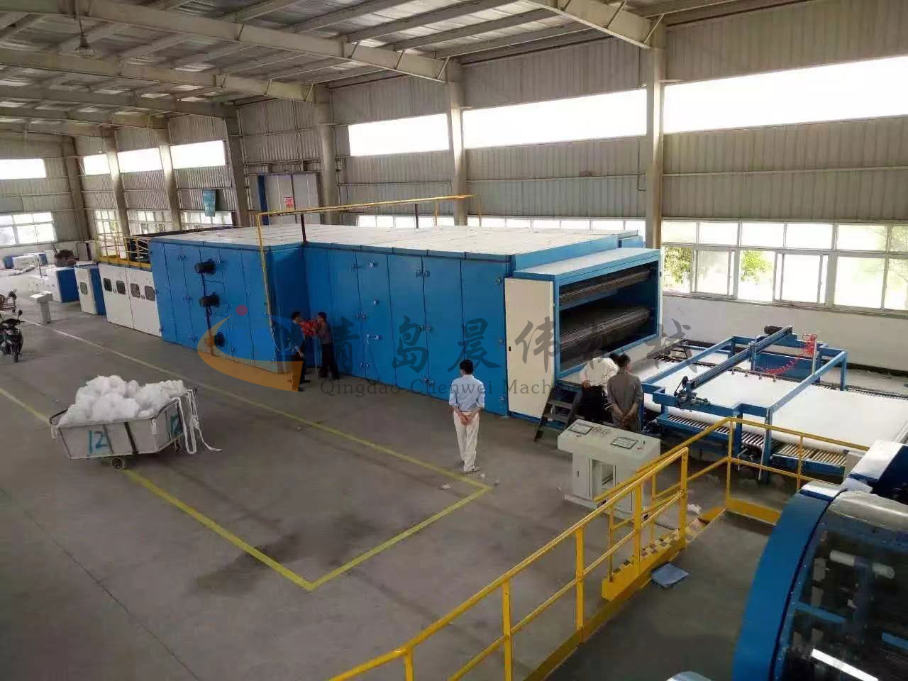 該生產(chǎn)線用于生產(chǎn)高檔家用紡織材料仿絲棉, 仿絲棉廣泛應(yīng)用于服裝、床上用品、家具等。根據(jù)客戶要求可分四機頭、六機頭、七機頭等。機頭越多,產(chǎn)量越高。